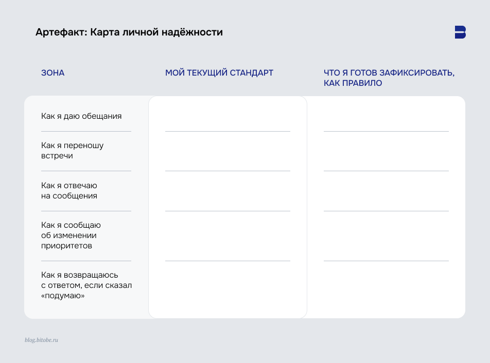 Это не список обещаний себе. Это рабочий инструмент: вы можете показать его команде или держать как личный регламент. Главное, чтобы стандарты были конкретными, а не декларативными.